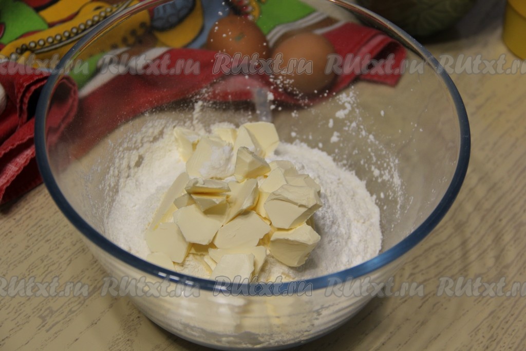 Холодный маргарин (или сливочное масло) нарезать на кусочки и добавить в сухие ингредиенты.