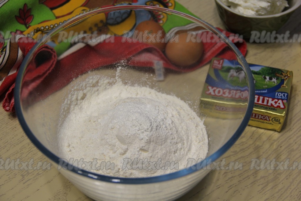 Вначале замесим крошку, которая и станет основой нашей ватрушки, для этого в объёмной миске нужно соединить сахар, муку и разрыхлитель, перемешать сухие ингредиенты.