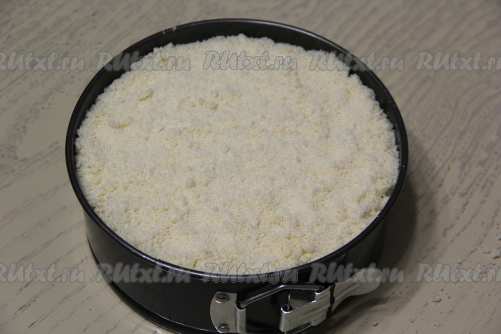 Перемешать творожную массу до однородности, она получится не густой. В форму для выпечки (я выпекала в разъёмной форме диаметром 20 см) равномерно выложить половину крошки и утрамбовать.