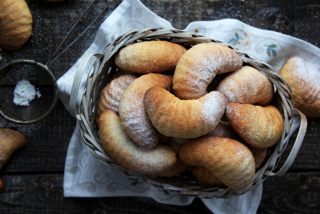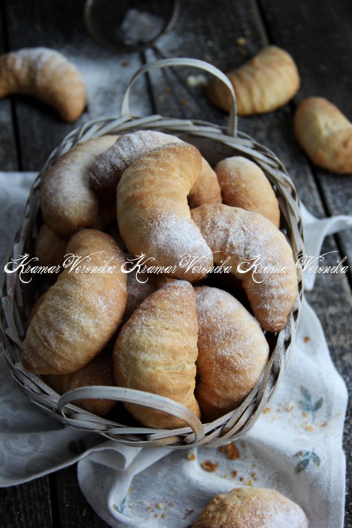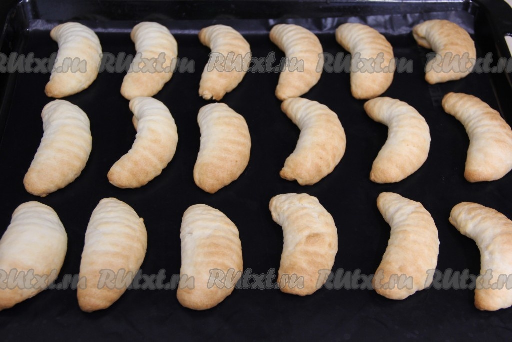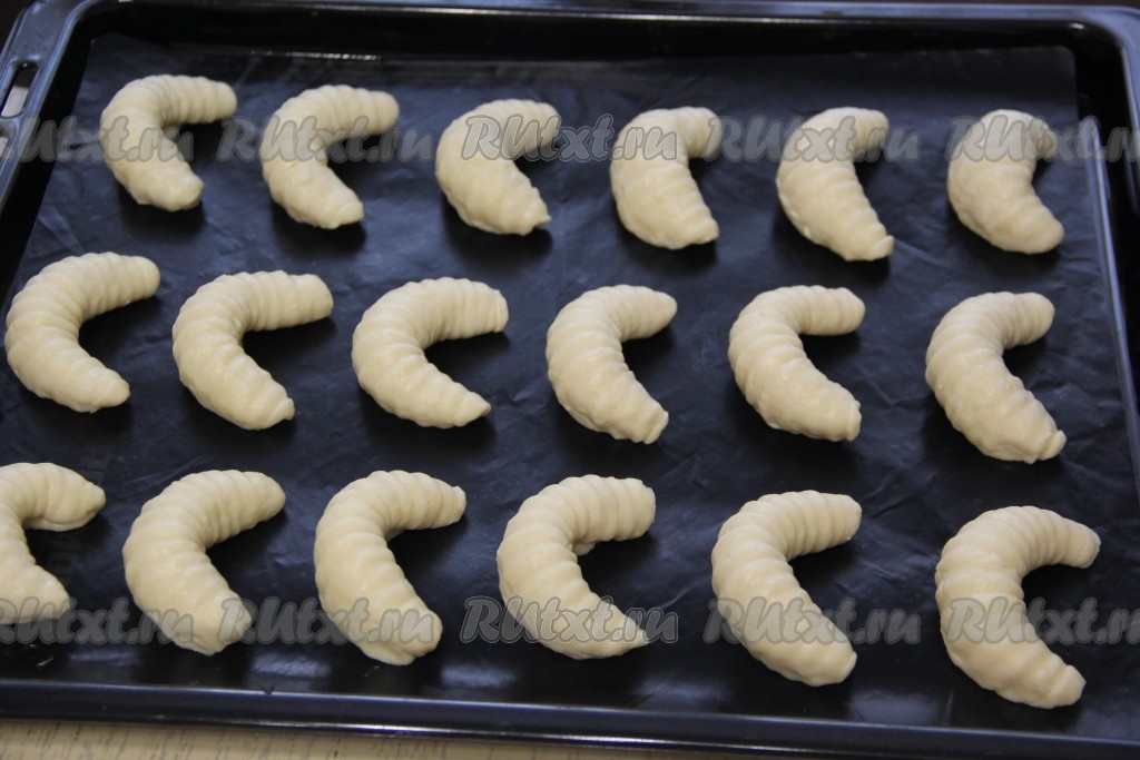 Слегка согнуть рулетик, придав форму полумесяца. Противень застелить пергаментом (или тефлоновым ковриком). Выложить печенье на противень. Аналогично сформировать все заготовки творожного печенья и выложить их на противень, оставляя между расстояние между печенюшками.