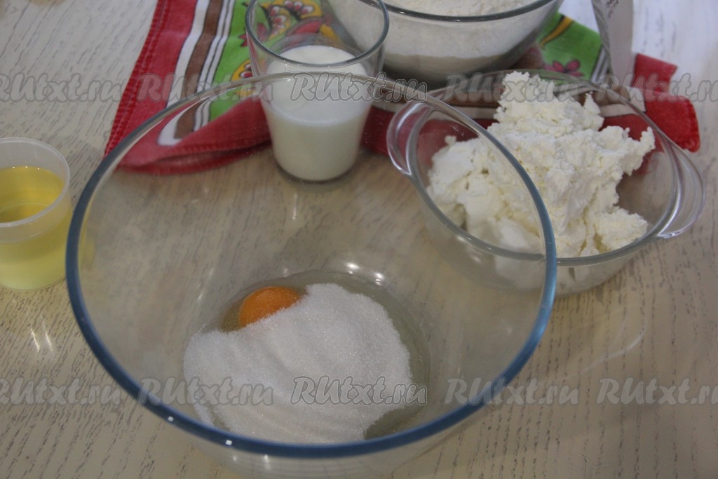 Вмешать творог в смесь кефира и яиц.