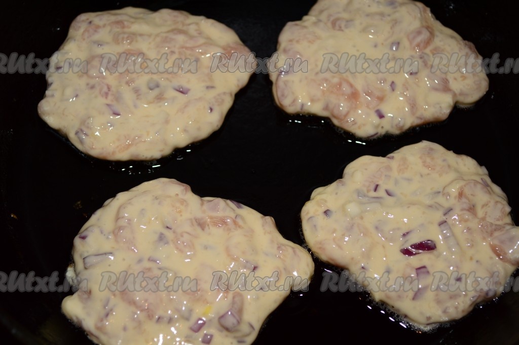 Сковороду хорошо разогреть с растительным маслом. Выкладывать по 1,5 столовых ложки теста, формируя оладушки. Жарить оладьи из рубленного куриного филе на среднем огне минуты 3 (до подрумянивания снизу).