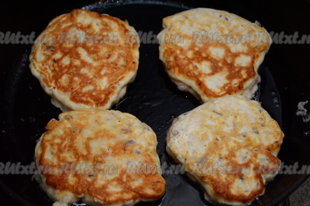 Затем перевернуть и жарить ещё 2-3 минуты, накрыв сковороду крышкой. Переложить готовые оладьи на тарелку. Оставшееся тесто хорошо перемешать, постепенно пожарить все куриные оладушки.