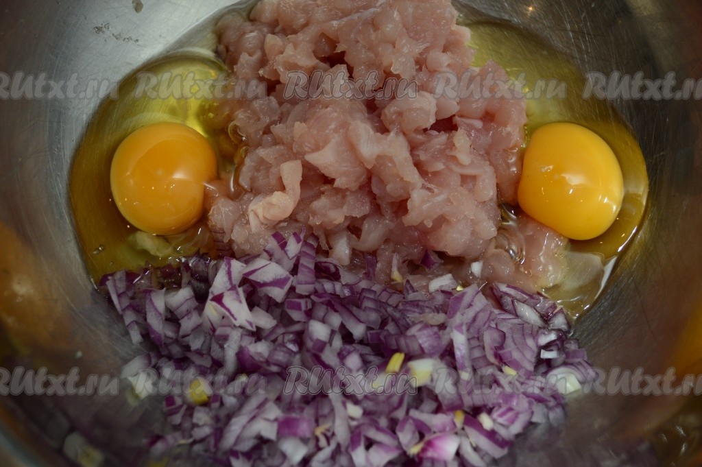 Куриное мясо вымыть, немного обсушить. Нарезать филе на очень мелкие кусочки, чем мельче вы нарежете мясо, тем более однородными и вкусными будут оладьи. Для этого рецепта не стоит пропускать филе через мясорубку. Репчатый лук очистить от кожуры и тоже нарезать мелко, чтобы лук не чувствовался в готовых оладьях. Соединить рубленное куриное филе, лук и сырые яйца в глубокой миске.