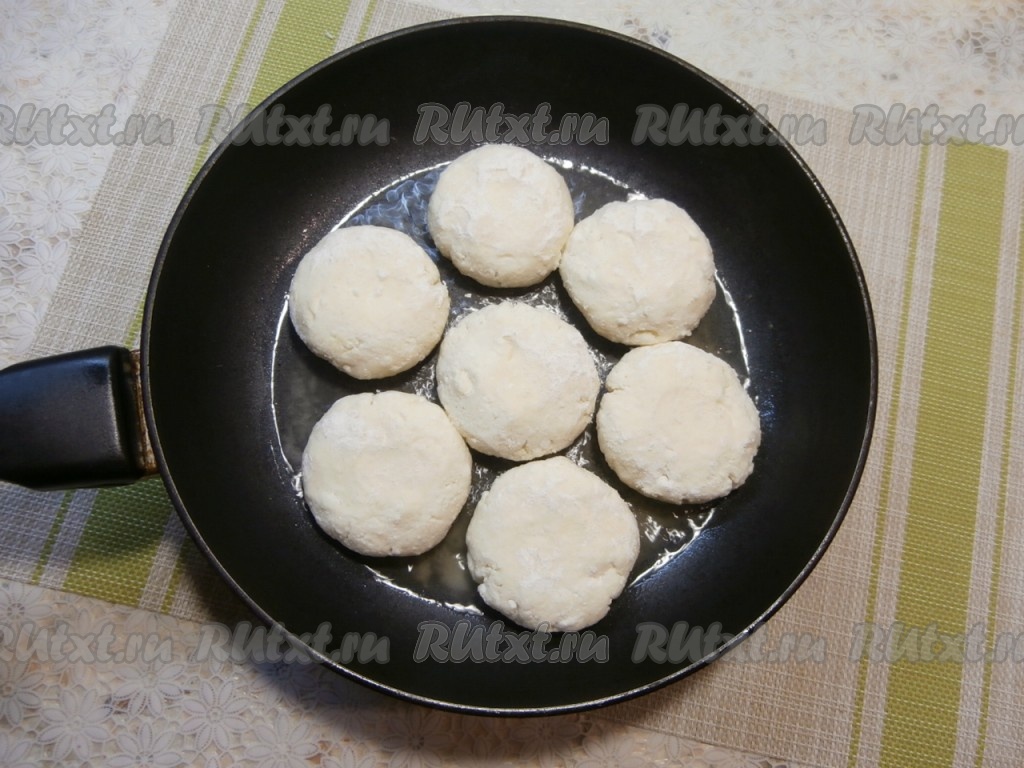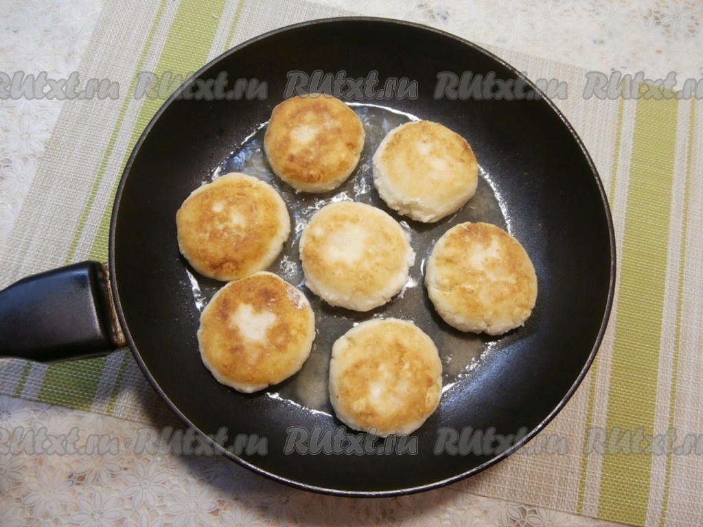 Жарить сырники нужно на небольшом огне, под прикрытой крышкой до румяности с двух сторон.