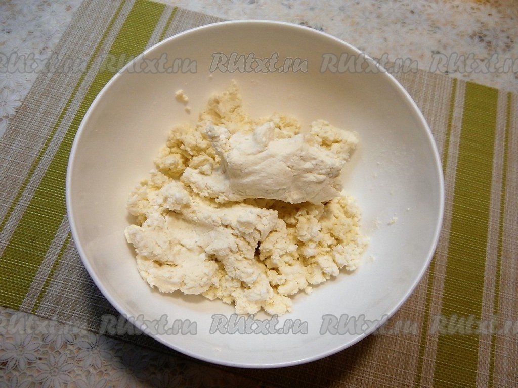 Замесить творожную массу, она должна при сжатии в руке держать форму. Муки может понадобиться чуть больше или меньше, ориентируйтесь по консистенции творожной массы.