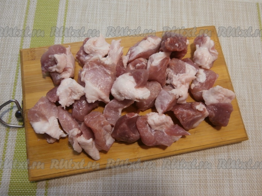 Мякоть свинины нарезать на средние кусочки. Морковку и лук очистить.
