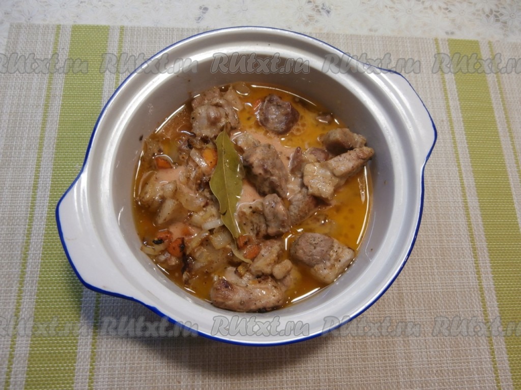 Кусочки свинины с овощами залить подготовленным томатно-сметанным соусом, добавить лавровый лист.
