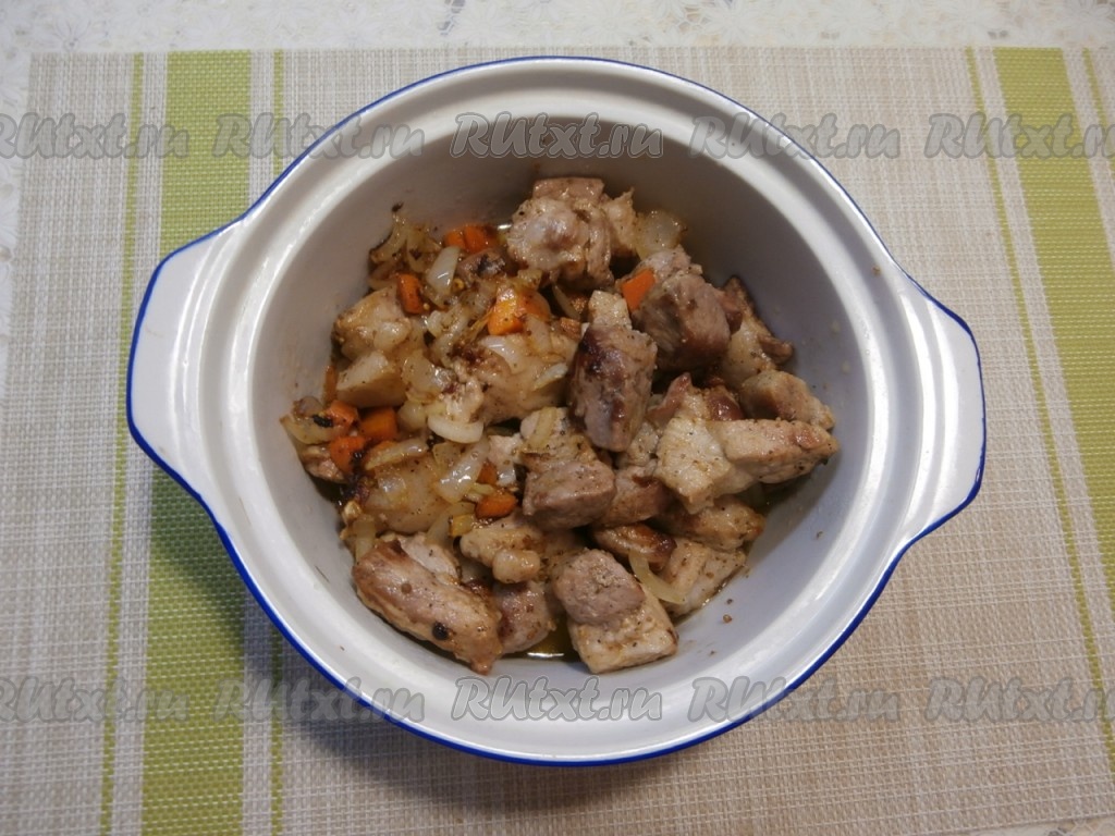 Когда кусочки свинины подрумянятся, выложить к ним нарезанный произвольно лук и нарезанную кубиками морковь.