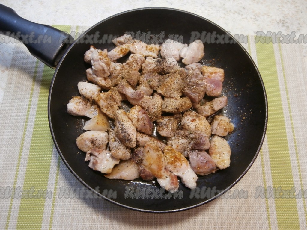 На сковороде прогреть растительное масло, затем выложить кусочки свинины и обжарить мясо на среднем огне до лёгкой румяности со всех сторон, периодически перемешивая. В процессе обжаривания мясо посыпать специями, хмели-сунели и чёрным молотым перцем.