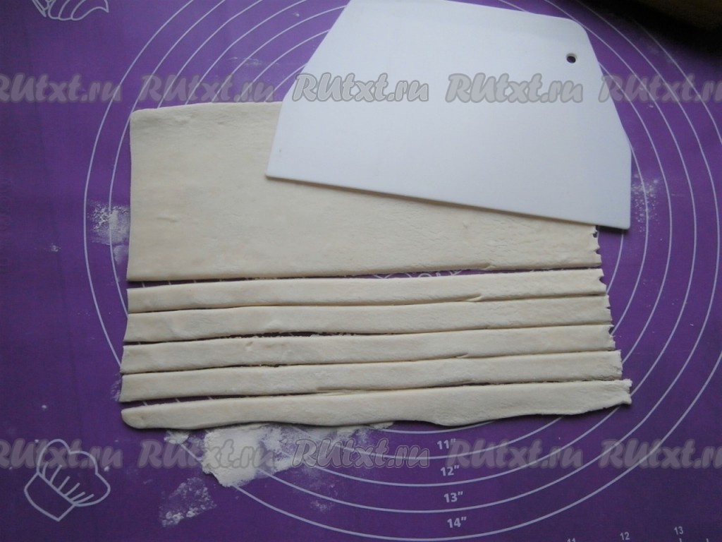 Нарезать раскатанное тесто на полоски шириной около 1 см. Длина полосок не имеет значения.