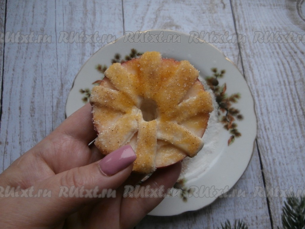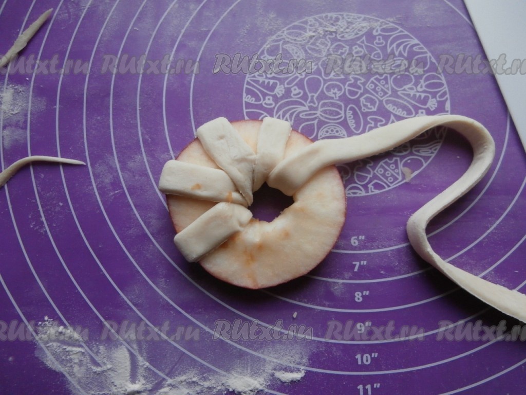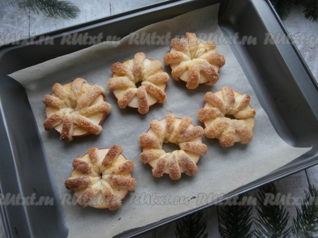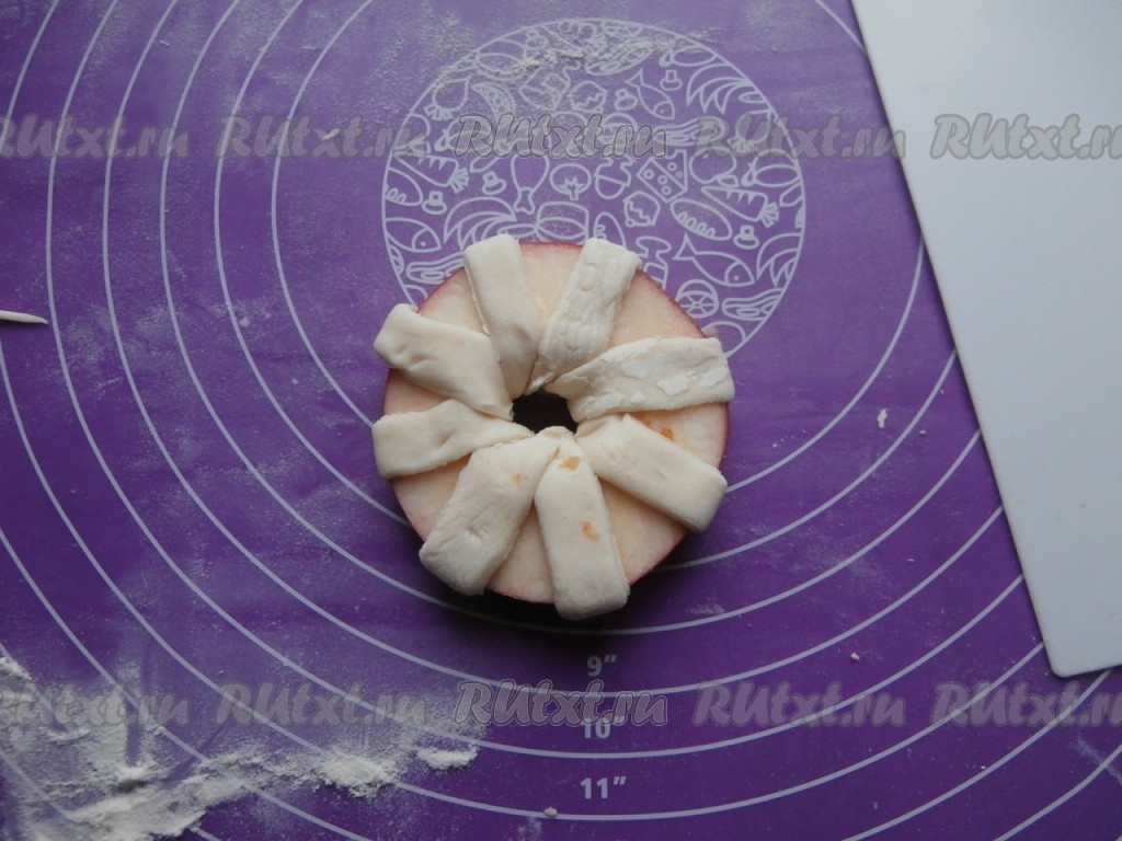 Обернуть яблочные кольца полосками слоёного теста через отверстия, как на фото.