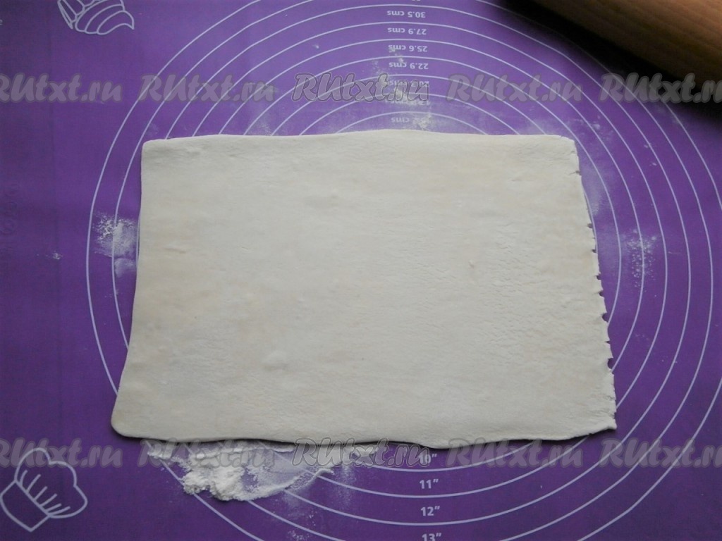 Пласт теста на слегка присыпанной мукой поверхности раскатать скалкой до толщины 3-4 мм.