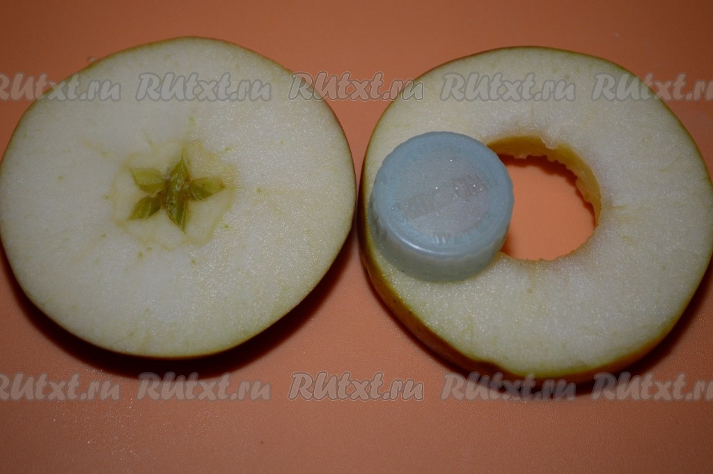 Слоёное тесто заранее разморозить. Яблоки лучше всего брать сладкие или кисло-сладкие с плотной мякотью. Яблоки нарезать кольцами толщиной около 1 см. Удалить середину с семенами. Для удаления серединки можно, например, воспользовалась обычной пробкой от пластиковой бутылки, а можно аккуратно вырезать сердцевину обычным острым ножом. Дырочку делайте побольше (диаметром 2-2,5 см), чтобы в дальнейшем можно было через неё достаточно просто просовывать полоски теста. Кожуру я не снимала, но вы можете снять кожуру.
