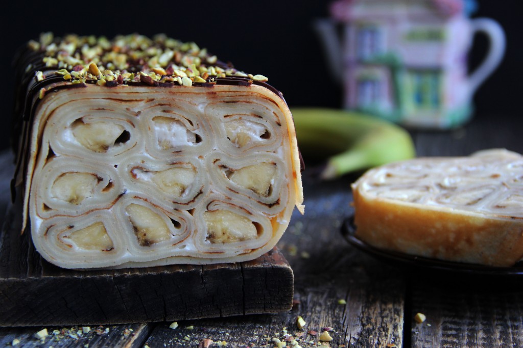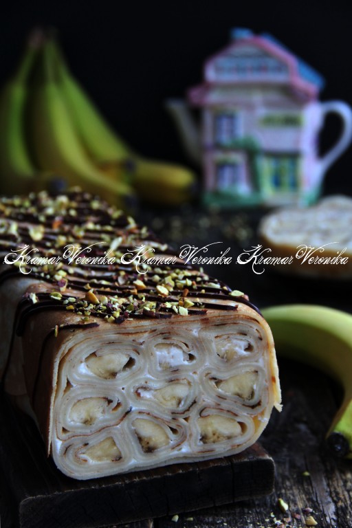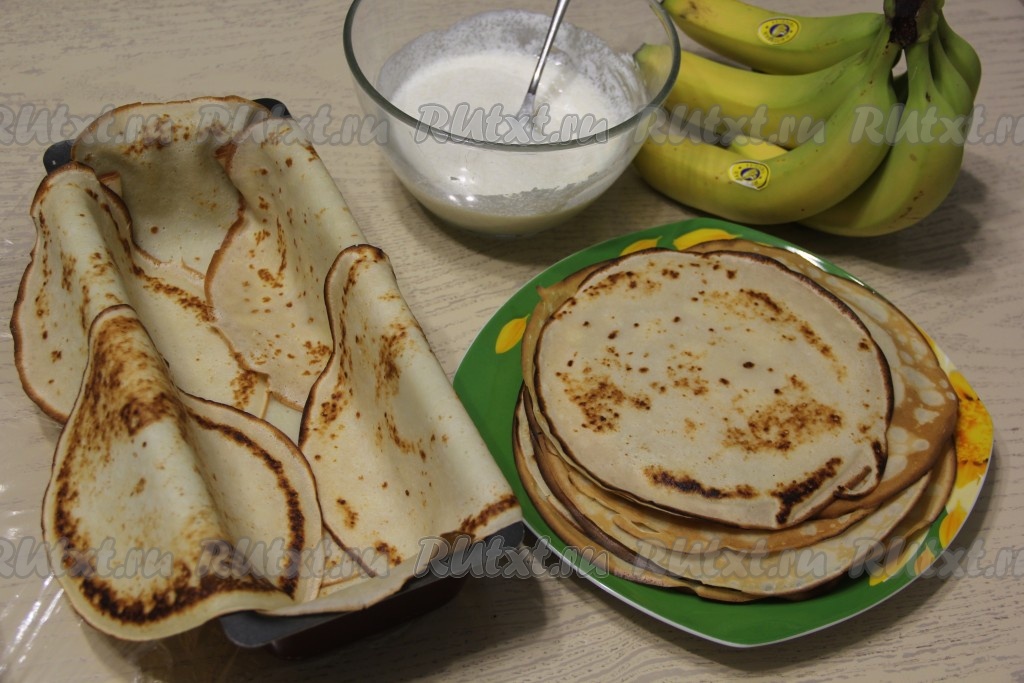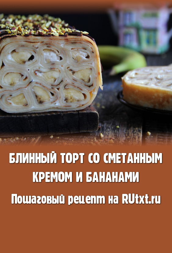 Для домашнего чаепития или к приходу гостей предлагаю приготовить вкусный, красивый блинный торт со сметанным кремом и бананами. Блинчики можно приготовить по любимому рецепту, я предлагаю использовать блины, замешанные на молоке, они получаются эластичными, поэтому отлично подходят для этого десерта. Сметану лучше взять жирностью 20%, а бананы - плотные и спелые. Формировать тортик можно в любой прямоугольной форме, выкладывая слоями рулетики из блинов с начинкой. Верх торта можно украсить шоколадом или покрыть любой глазурью. Блинный тортик получается очень вкусным, в меру сладким, сытным, обязательно приготовьте его для себя и своих близких!