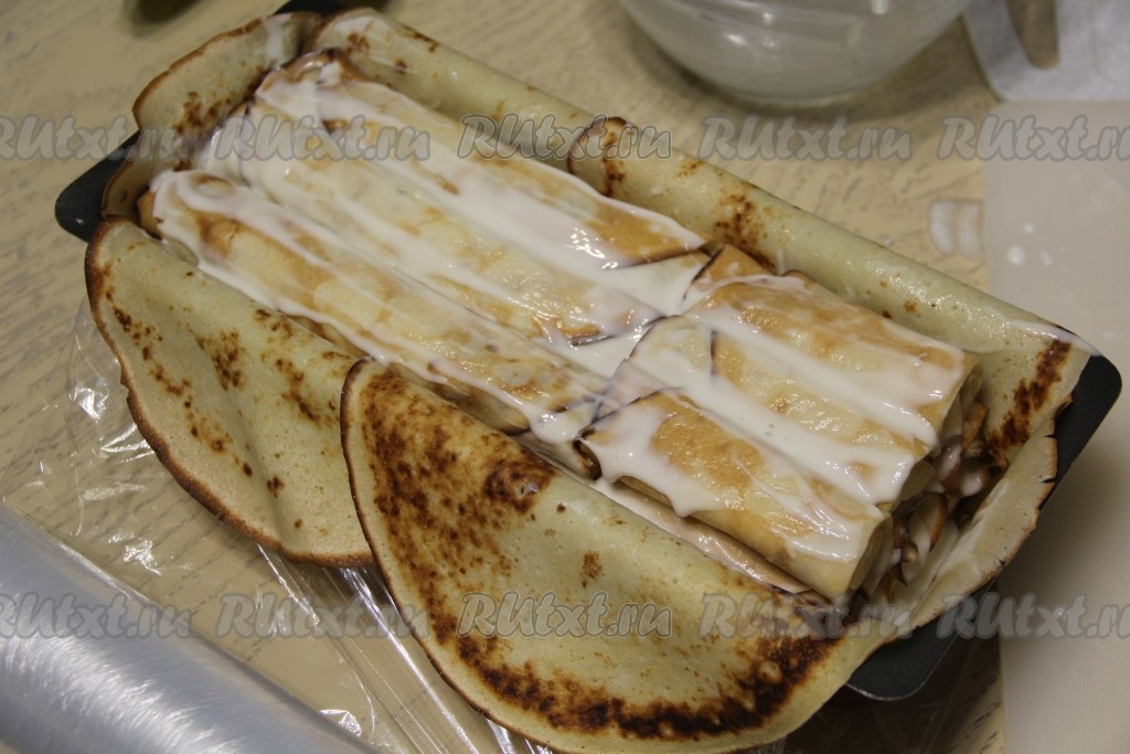 Смазать дно формы с блинами сметанным кремом.