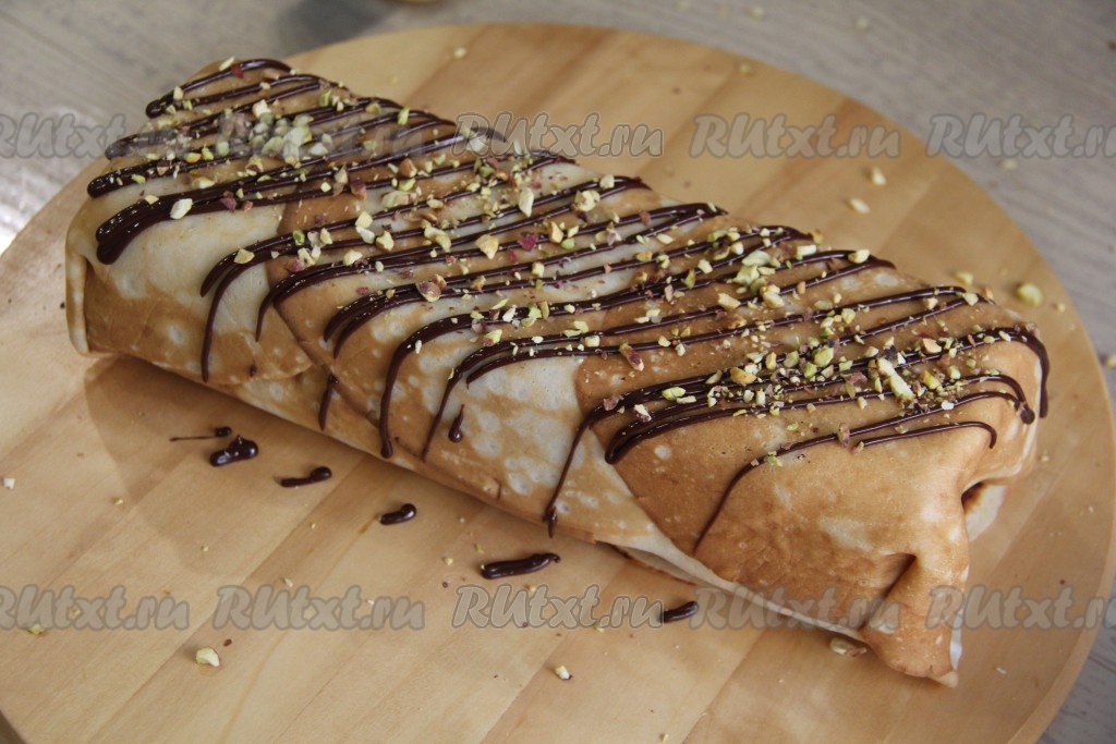 Накрыть форму плёнкой и поставить в холодильник на ночь. Готовый блинный торт достать из формы, убрать плёнку и переложить на тарелку или доску. Я дополнительно украсила верх тортика, растопив пару долек шоколада и сделав решётку поверх торта, а затем посыпала дроблёными фисташками.