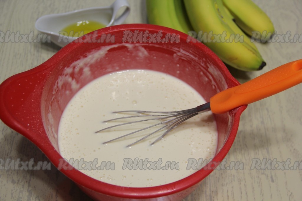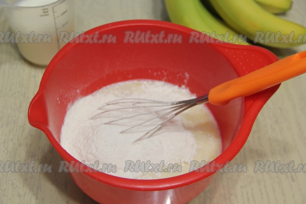 Всыпать муку, тщательно перемешать венчиком, разбивая мучные комочки (до однородности).