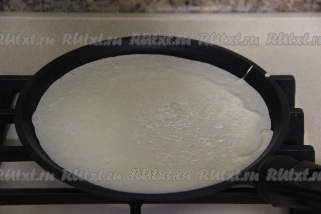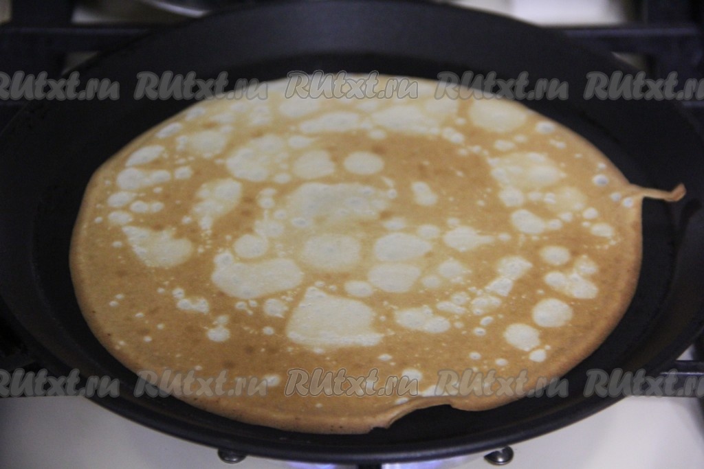 Сковороду (я готовила на сковородке диаметром 20 см) очень хорошо разогреть на огне чуть выше среднего. Перед выпечкой первого блина смазать сковороду маслом, в дальнейшем можно жарить блинчики на сухой сковороде, ведь масло входит в состав блинного теста. На разогревшуюся сковороду налить половник теста, равномерно распределить его и жарить блинчик на среднем огне до румяности с двух сторон.