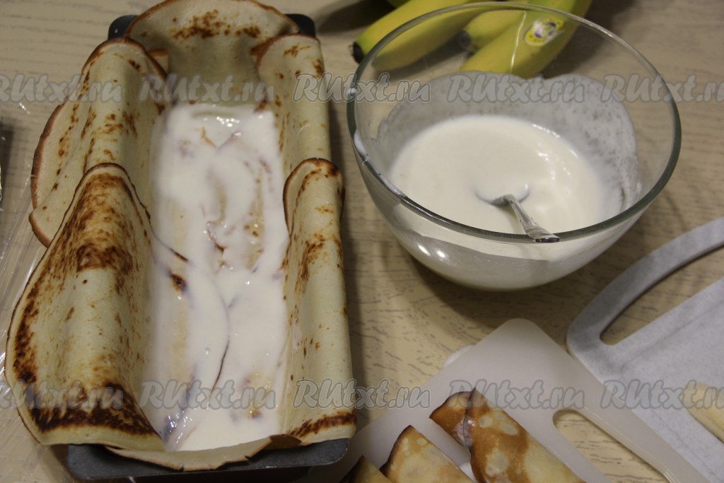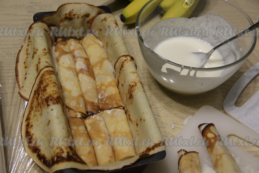 Плотно выложить рулетики из блинов с бананами в форму. Если рулетик не влезает целиком, то его можно подрезать по длине формы.