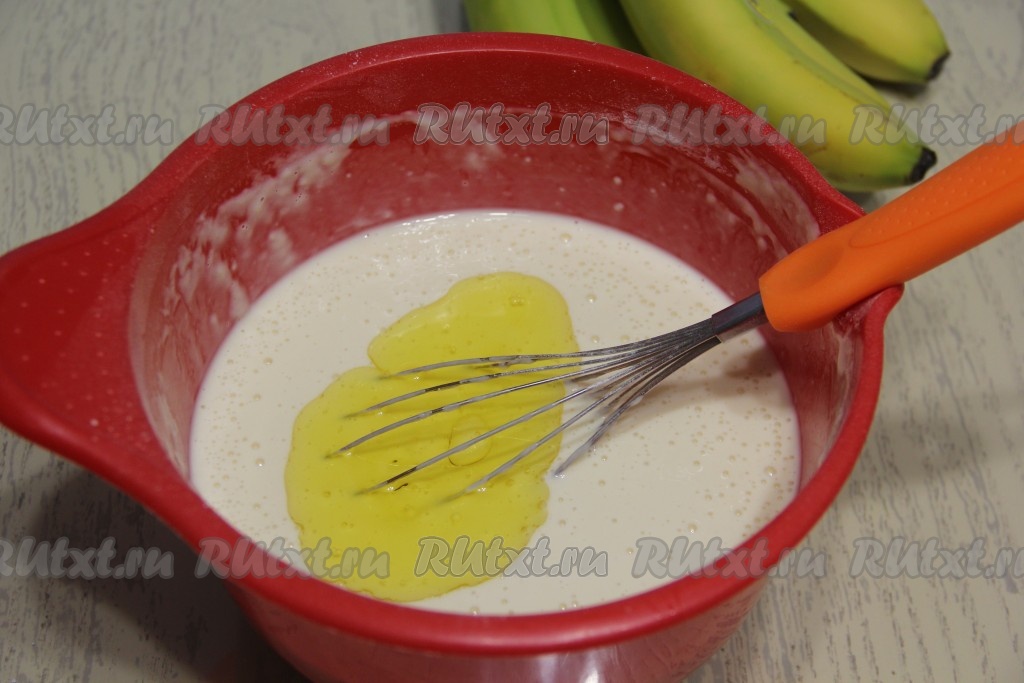 Затем влить растительное масло, снова перемешать до однородности, блинное тесто должно получиться в меру густым.