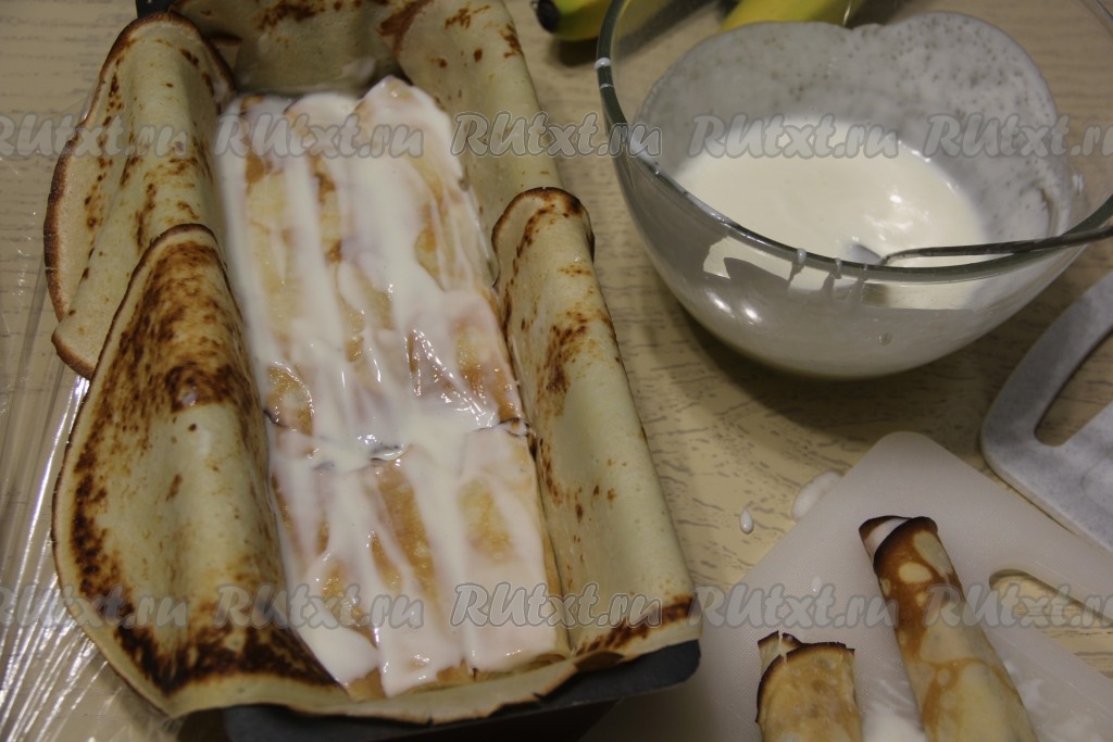 Каждый блин смазать сметанным кремом и выложить брусок банана. Я бананы разрезала на 4 части вдоль. Скрутить блин с начинкой в плотный рулетик.