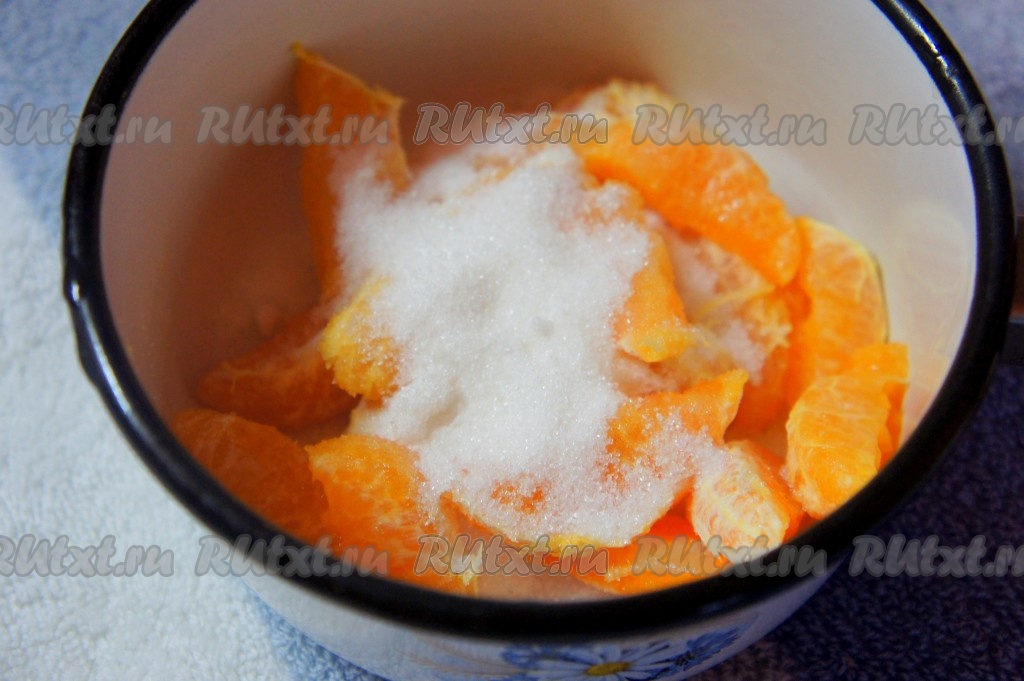 Сначала готовим мандариновый соус. Для этого очистить мандарины, разделить на дольки и удалить косточки, если они есть. Добавить сахарный песок. Поставить на огонь и варить до загустения. Периодически перемешивайте соус.
