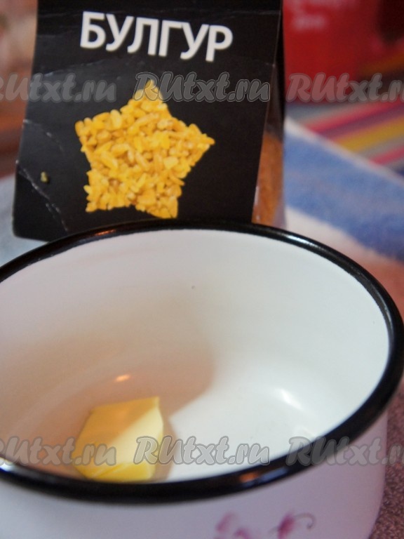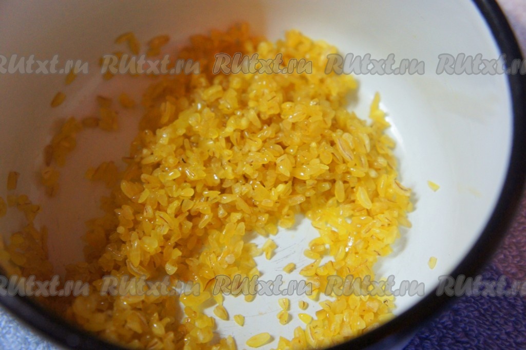 Добавить булгур в растопленное масло, тщательно и быстро перемешать.