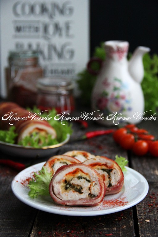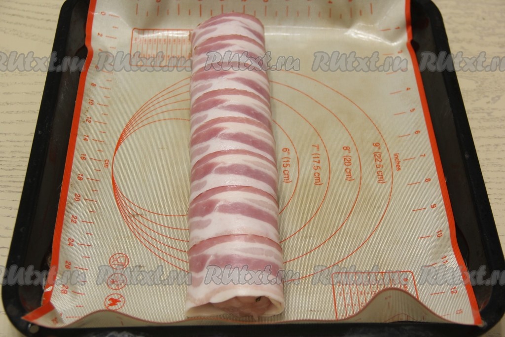С куриного рулета аккуратно снять пищевую плёнку. Выложить куриный рулет на край бекона и завернуть его в слой бекона, помогая себе формировать рулет в беконе с помощью пищевой плёнки. Не заворачивайте пищевую плёнку вместе с беконом, а аккуратно её снимайте с завёрнутого края. Конечно же запекать рулет мы должны без плёнки.