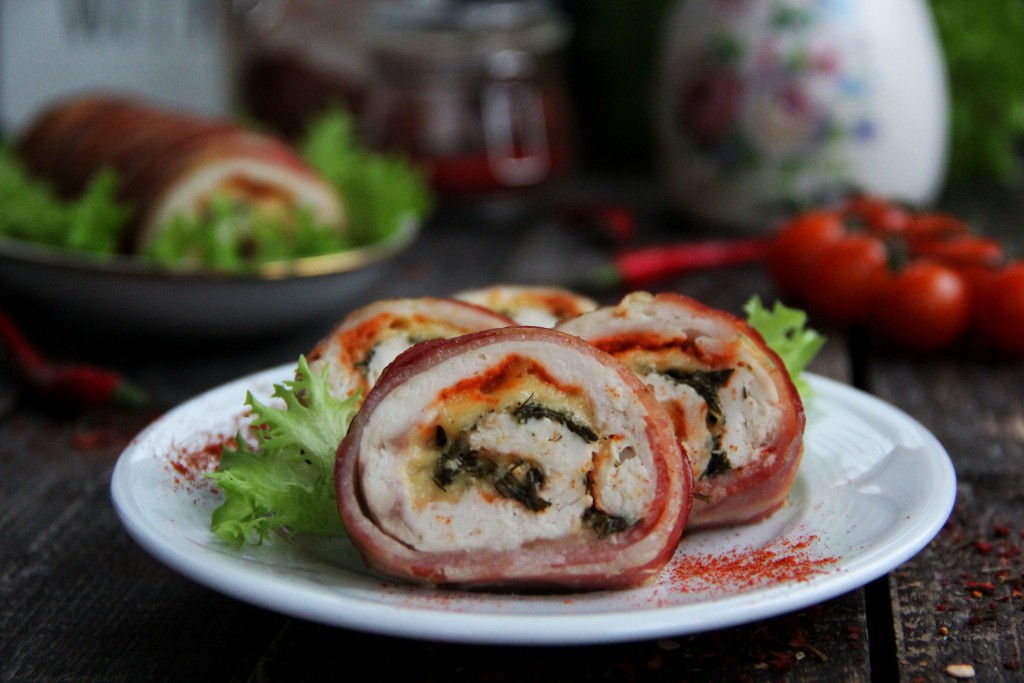 Готовый рулет достать из духовки, переложить на тарелку, дать ему полностью остыть, тогда он прекрасно нарезается на тонкие ломтики. Благодаря бекону и сыру, куриный рулет получается ароматным, сочным и очень вкусным, он станет отличной холодной закуской, а если подать его на кусочке хлеба, он станет прекрасной альтернативой колбасным изделиям.