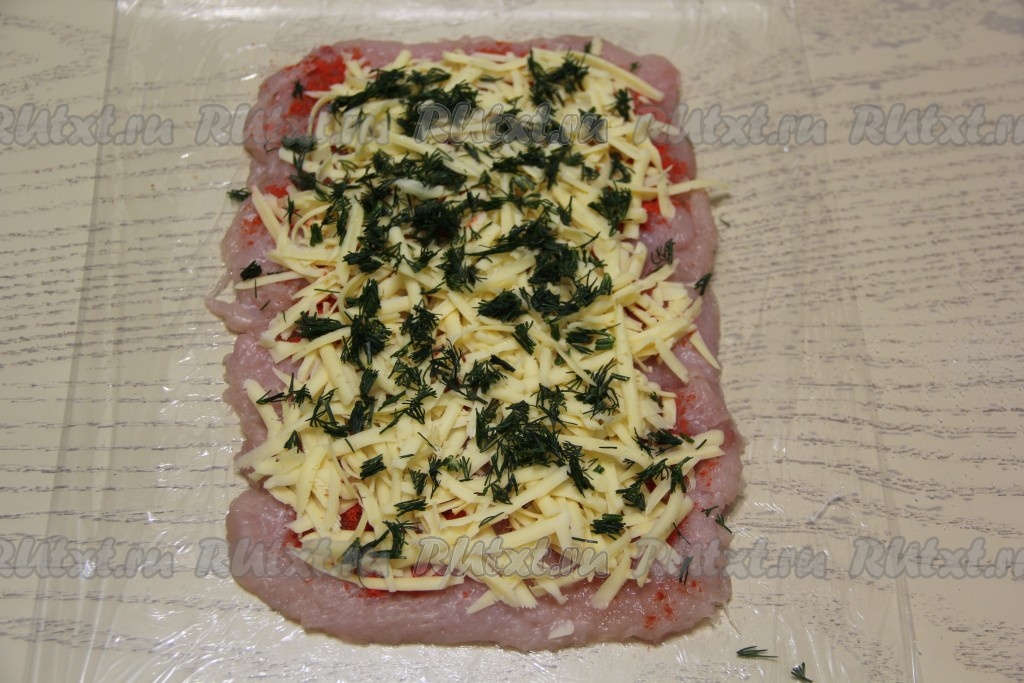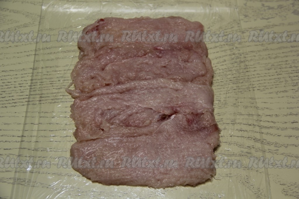 Каждое куриное филе разрезать вдоль, не дорезая до конца, и развернуть, как книгу. Филе отбить до тонкого состояния. Выложить один за другим два филе на пищевую плёнку.