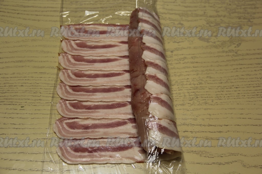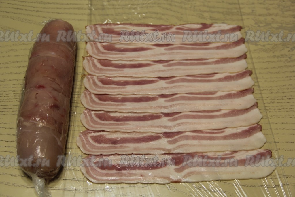 Свернуть куриное филе с помощью пищевой плёнки в ровный рулет. Взять ещё кусок плёнки, выложить на неё тонко нарезанные полоски бекона в внахлёст, как на фото.