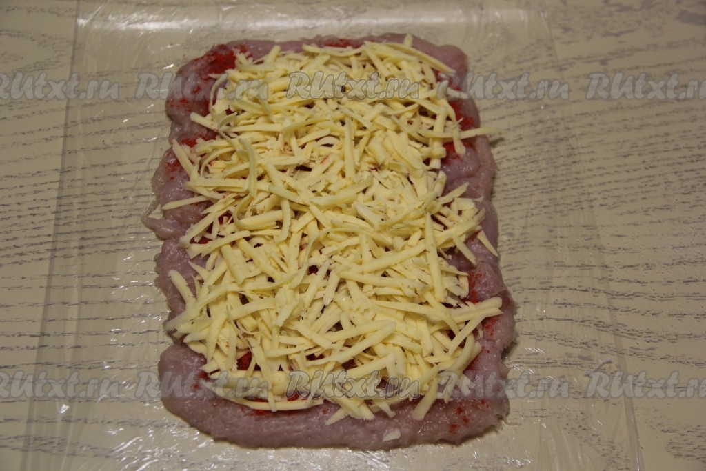 Сыр натереть на тёрке и выложить ровным слоем на куриное филе.