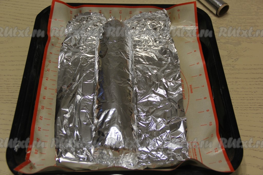 Выложить подготовленный рулет на противень, застеленный силиконовым ковриком для выпечки (или пергаментом).