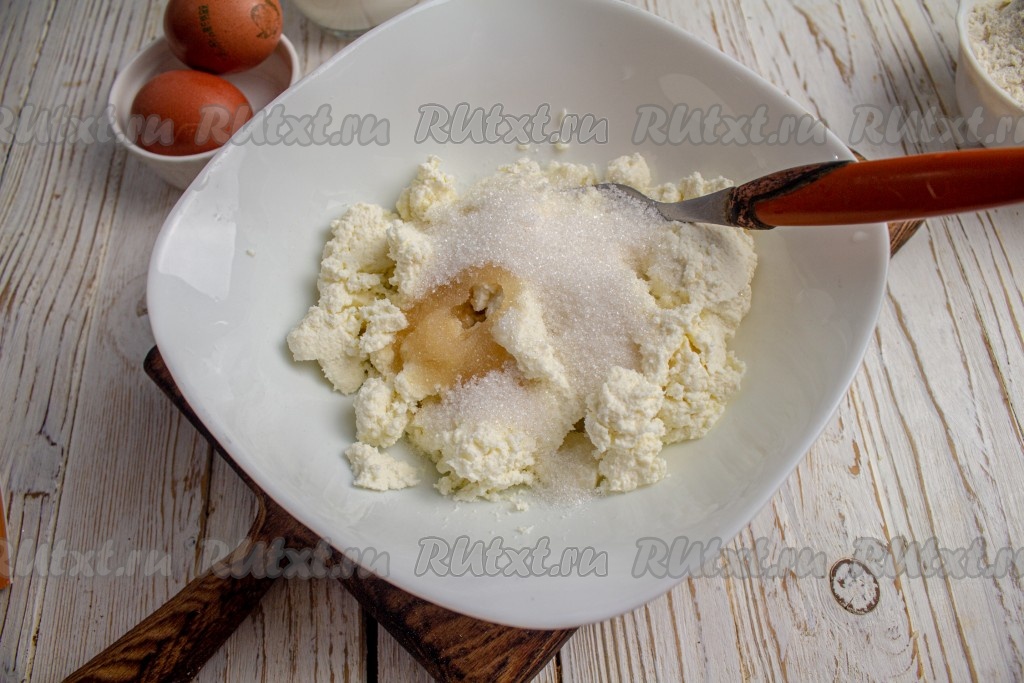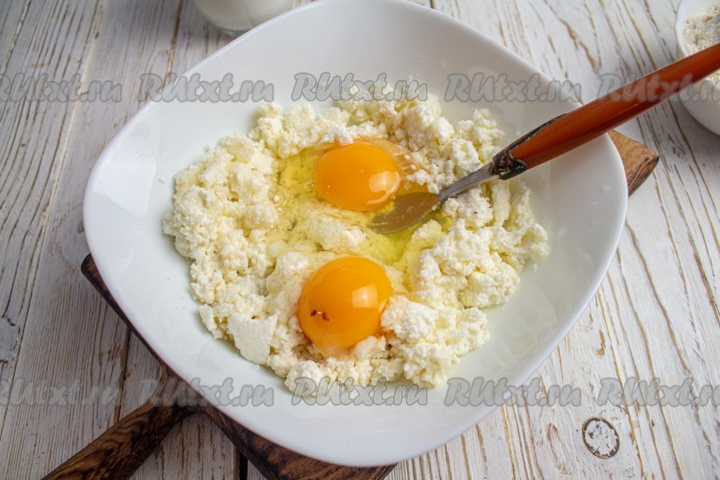 В творог с сахаром вбейте куриные яйца и перемешайте массу вилкой.