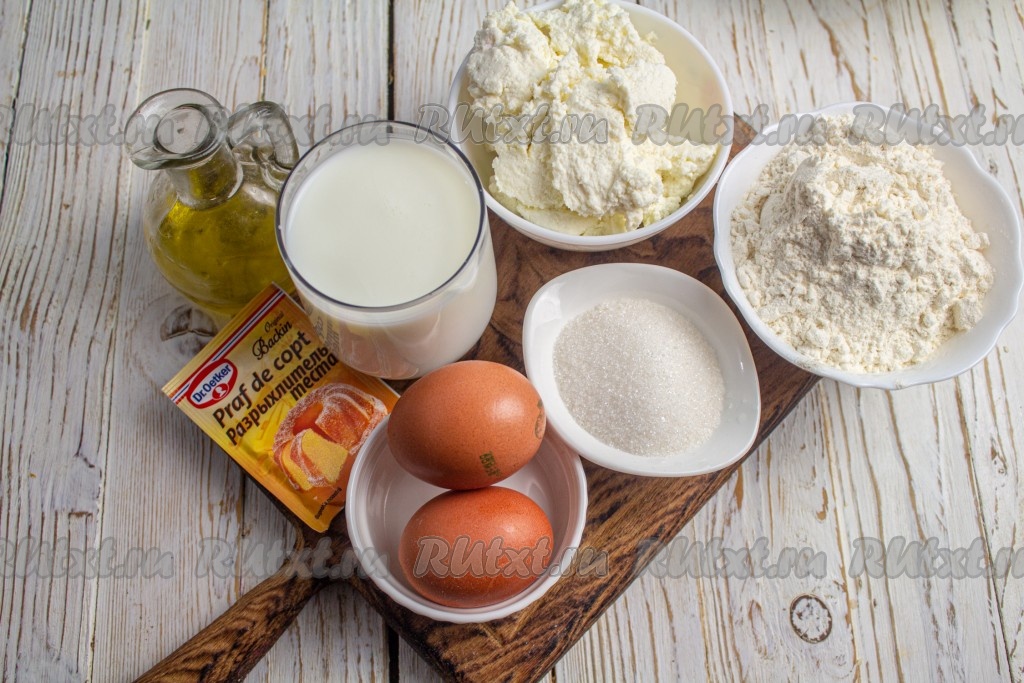 Желательно, чтобы все ингредиенты были комнатной температуры. Поэтому за 15-20 минут до начала приготовления достаньте из холодильника кефир, яйца и творог.