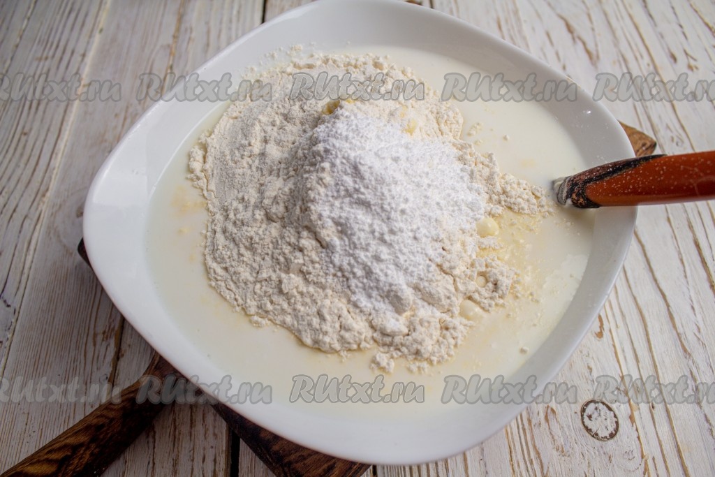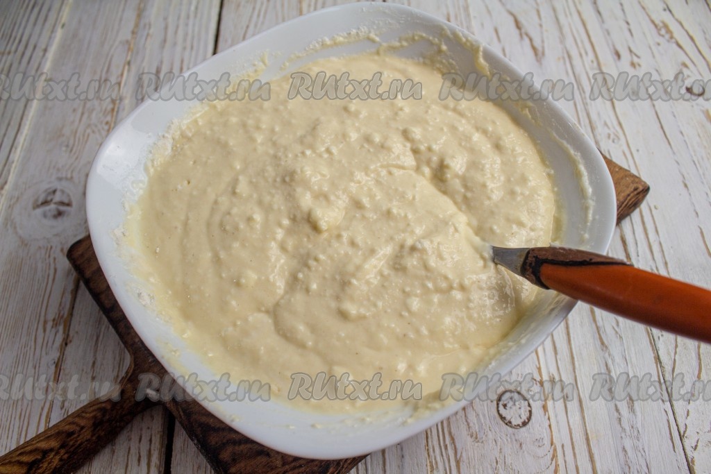 Всыпьте просеянную муку, соль и разрыхлитель, перемешайте тесто до однородности.