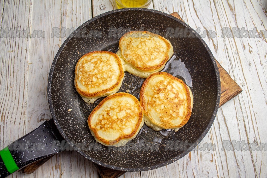 Перед выпечкой обязательно перемешивайте тесто. На сковороде хорошо прогрейте немного растительного масла, выкладывайте по столовой ложке теста в виде круглых оладий. Оладьи нужно выкладывать на некотором расстоянии друг от друга, так как они немного увеличатся в процессе выпечки. Жарьте оладьи на среднем огне до золотистого цвета (2-3 минуты), затем переверните на другую сторону, накройте крышкой и продолжайте жарку ещё 2 минуты. Переложите готовые оладьи со сковороды на бумажное полотенце для удаления лишнего масла. Аналогично пожарьте все оладушки.