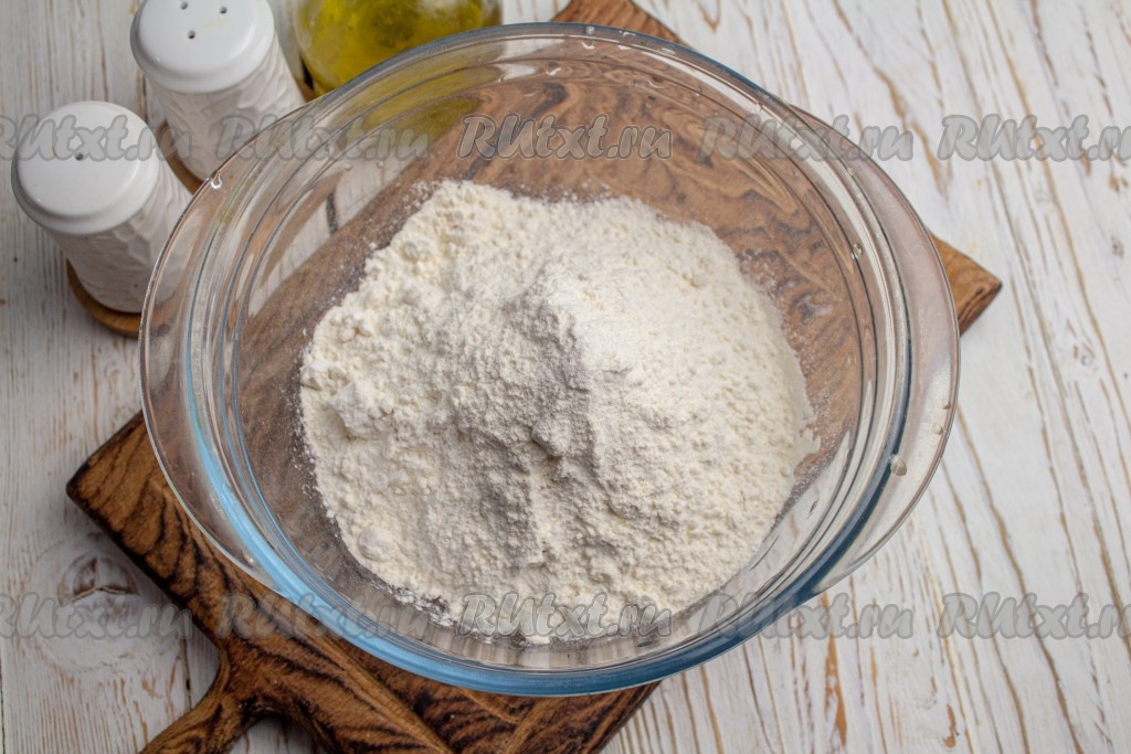 Вначале замесим тесто, для этого в миску просейте 200 грамм муки, добавьте соль. А 50 грамм муки отложите.