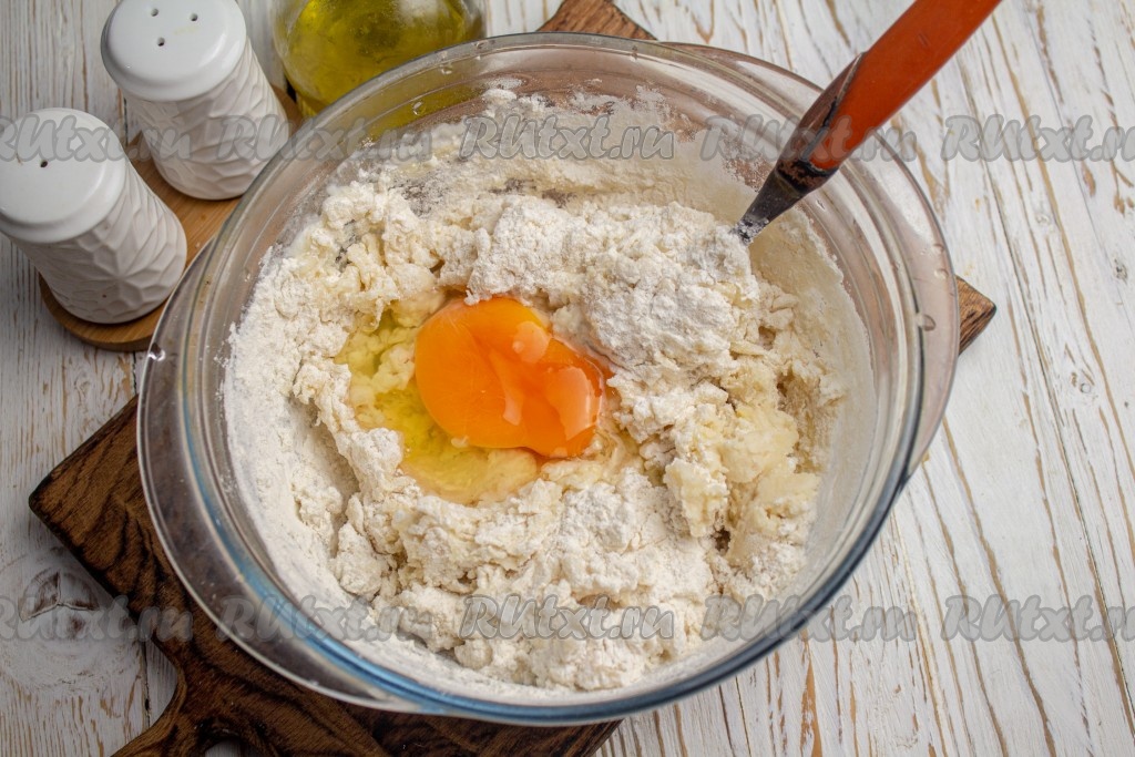 Добавьте куриное яйцо, перемешайте тесто.