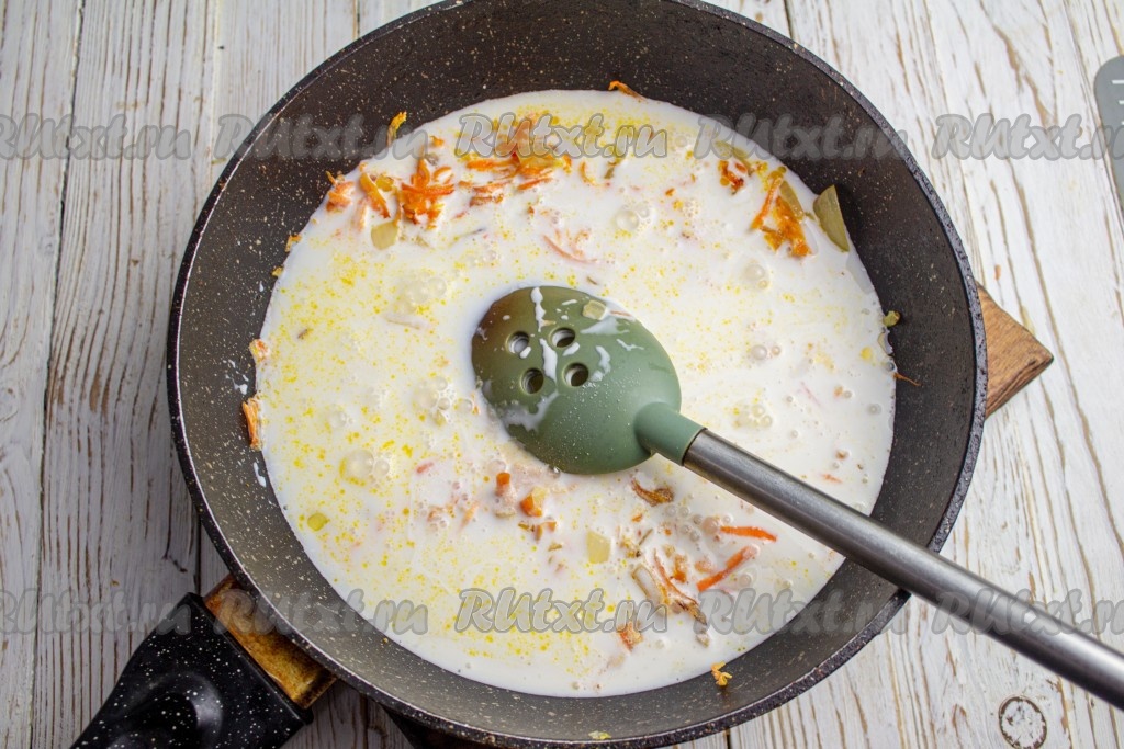 Теперь займёмся соусом, для этого очистите морковку и луковицу. На сковороде нагрейте растительное масло, выложите нарезанный на мелкие кубики лук и натёртую морковь. Обжаривайте овощи в течение 5-6 минут (до мягкости) на среднем огне, иногда перемешивая.