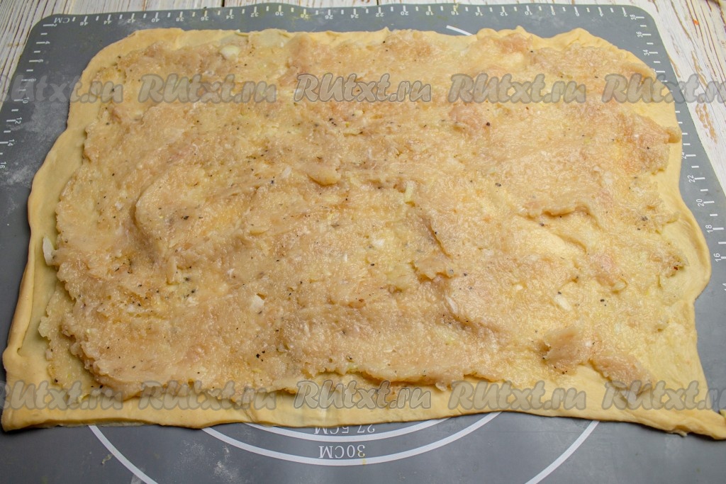 Сверните тесто с фаршем в рулет.