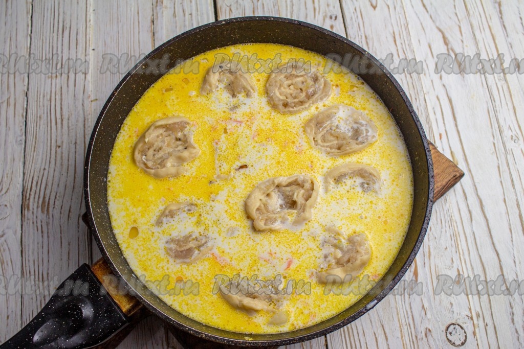 В сковороду к соусу выложите на небольшом расстоянии друг от друга заготовки ленивых пельменей. Снова доведите соус до кипения, убавьте огонь до минимума и тушите пельмени минут 20-25 под закрытой крышкой.