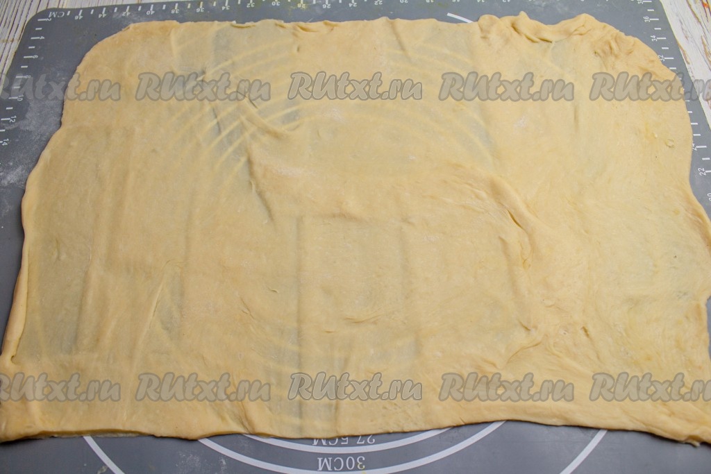 "Отдохнувшее" тесто на слегка припылённой мукой поверхности раскатайте в тонкий пласт толщиной 2-3 мм.