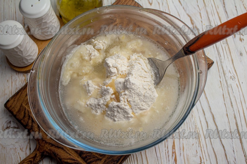 Влейте к муке растительное масло.