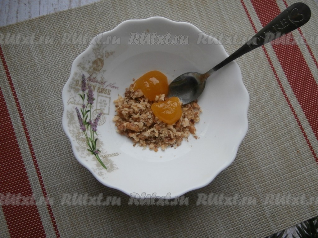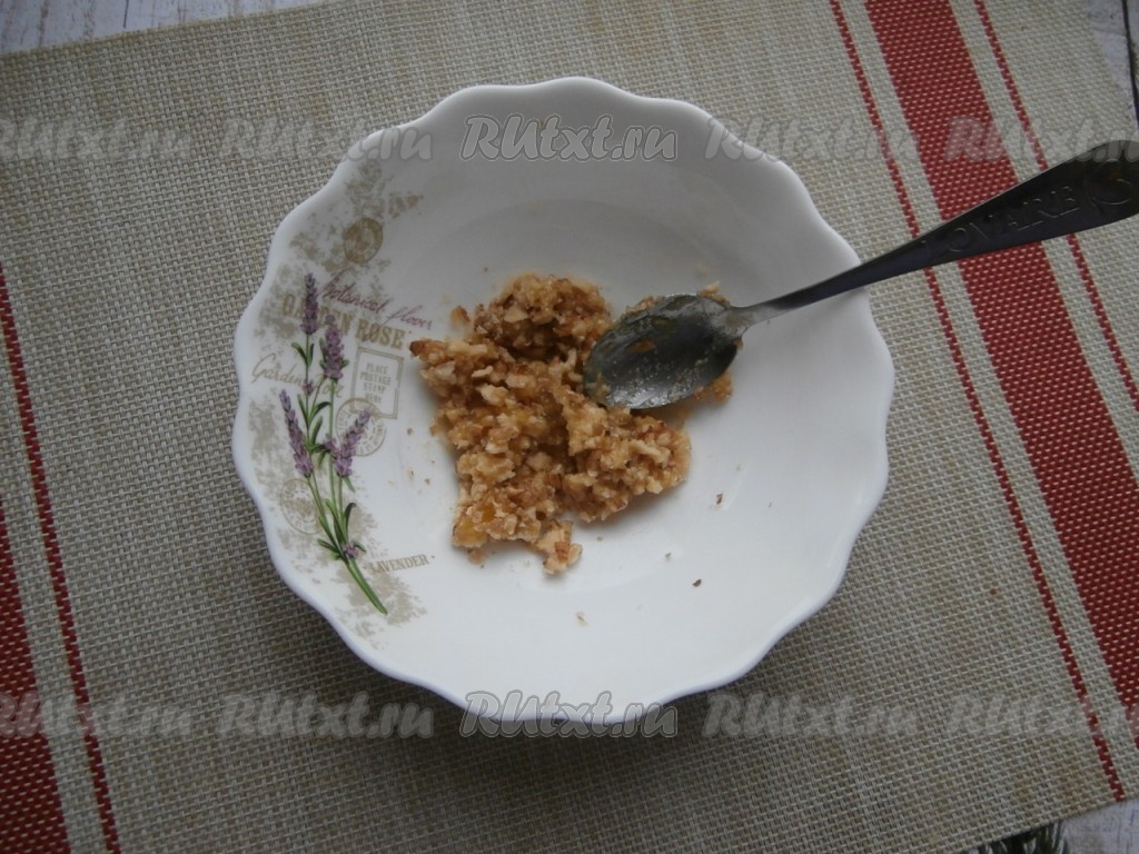 Ядра грецких орехов для этого десерта нужно нарезать ножом на небольшие кусочки, выложить в тарелку, добавить мёд.
