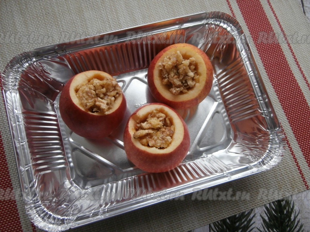 Наполнить углубления яблок орехово-медовой смесью. Поместить яблоки с начинкой в любую, подходящую для запекания форму.