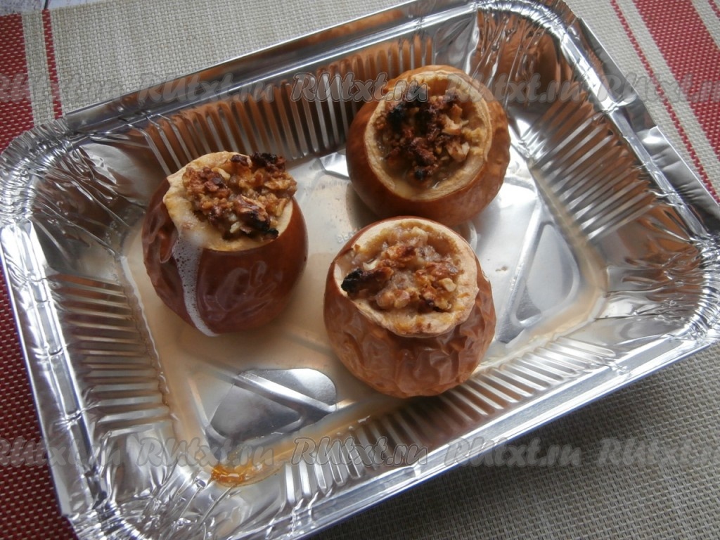 Отправить форму с фаршированными яблоками на 20-30 минут в разогретую до 180 градусов духовку. Продолжительность запекания во многом зависит от сорта яблок. Запечённые яблочки должны хорошо держать форму, но при этом они должны быть и достаточно мягкими.