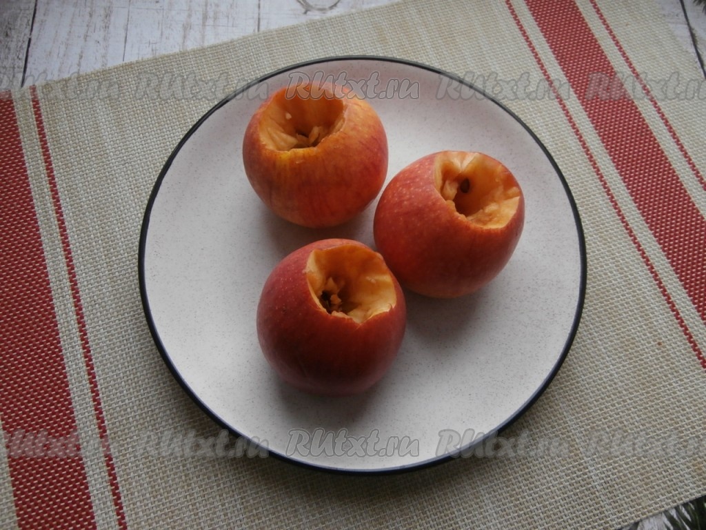 Яблоки помыть, вырезать часть мякоти ножом (или другим приспособлением), чтобы образовалось углубление внутри каждого яблока.