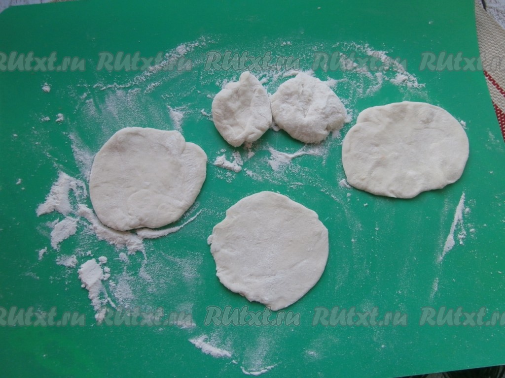Тесто для вареников разделить на небольшие кусочки. Подкатать кусочки теста в шарики и на присыпанной мукой поверхности раскатать каждый шарик теста в тонкую лепёшку.